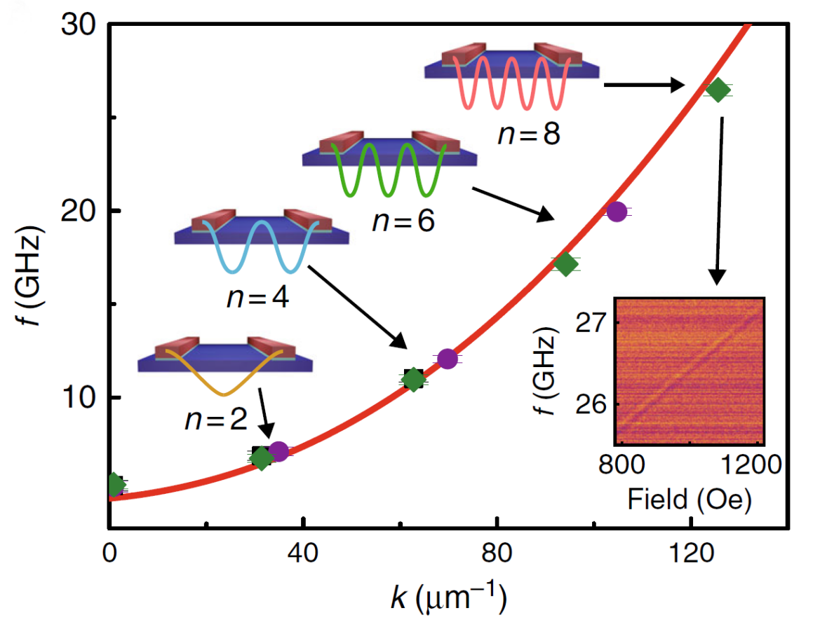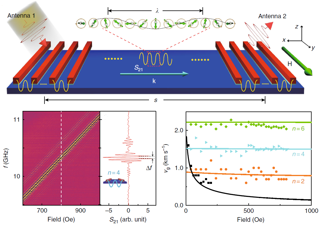 激發超短波長的自旋波能夠減小器件尺寸,提高集成度,同時短波長對應著更高的頻率,自旋邏輯器件也會有更快的運算速度。但想要激發出短波長自旋波可不容易,實驗過程中所需測量的自旋波頻率最高超過了30GHz,這已經接近目前測量系統的極限,為了獲得令人信服的結果,于教授的團隊通過長時間的校準和調試才得到了清晰的自旋波信號,為之后的進一步理論分析打下了可靠的基礎。